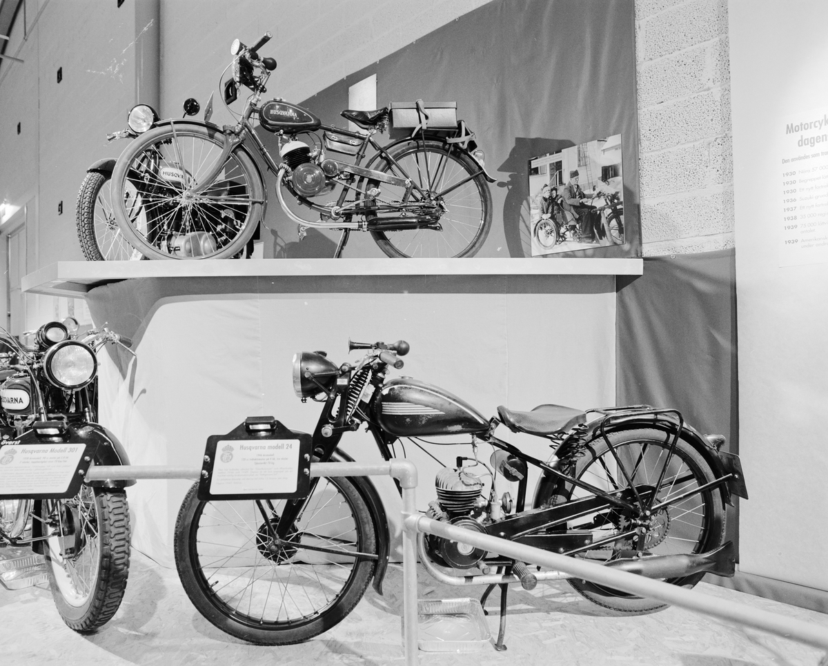 Dokumentation av "Motorcykeln 100 år" i Wallenberghallen. Motorcykel, Husqvarna "svartkvarna", årsmodell 1950.