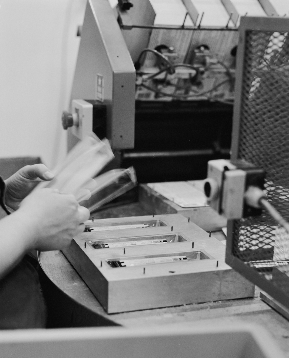 Blistermaskin. Plast "bubblor" läggs ner i 3 st fack därefter 3 tuber med baksidan upp. Om man kör med automatik snurrar plattan ett kvarts varv. Där lägger "sugkoppar ner "bakplattot".