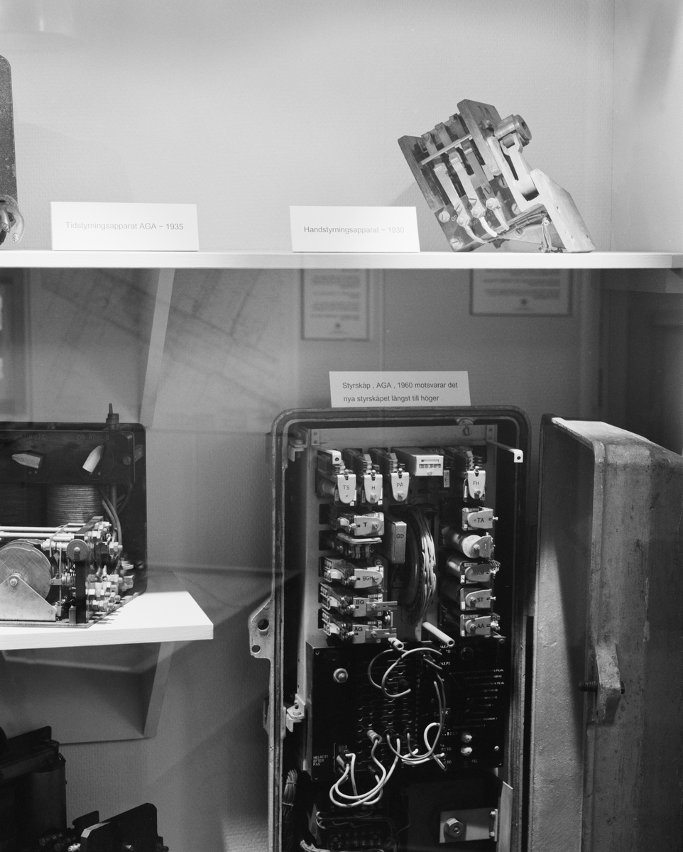 Dokumentation av utställningen "Tunnelbanetorget", Elkraftsmuseet. Monter med den historiska apparattekniken. Apparater för att sköta trafikljusen.