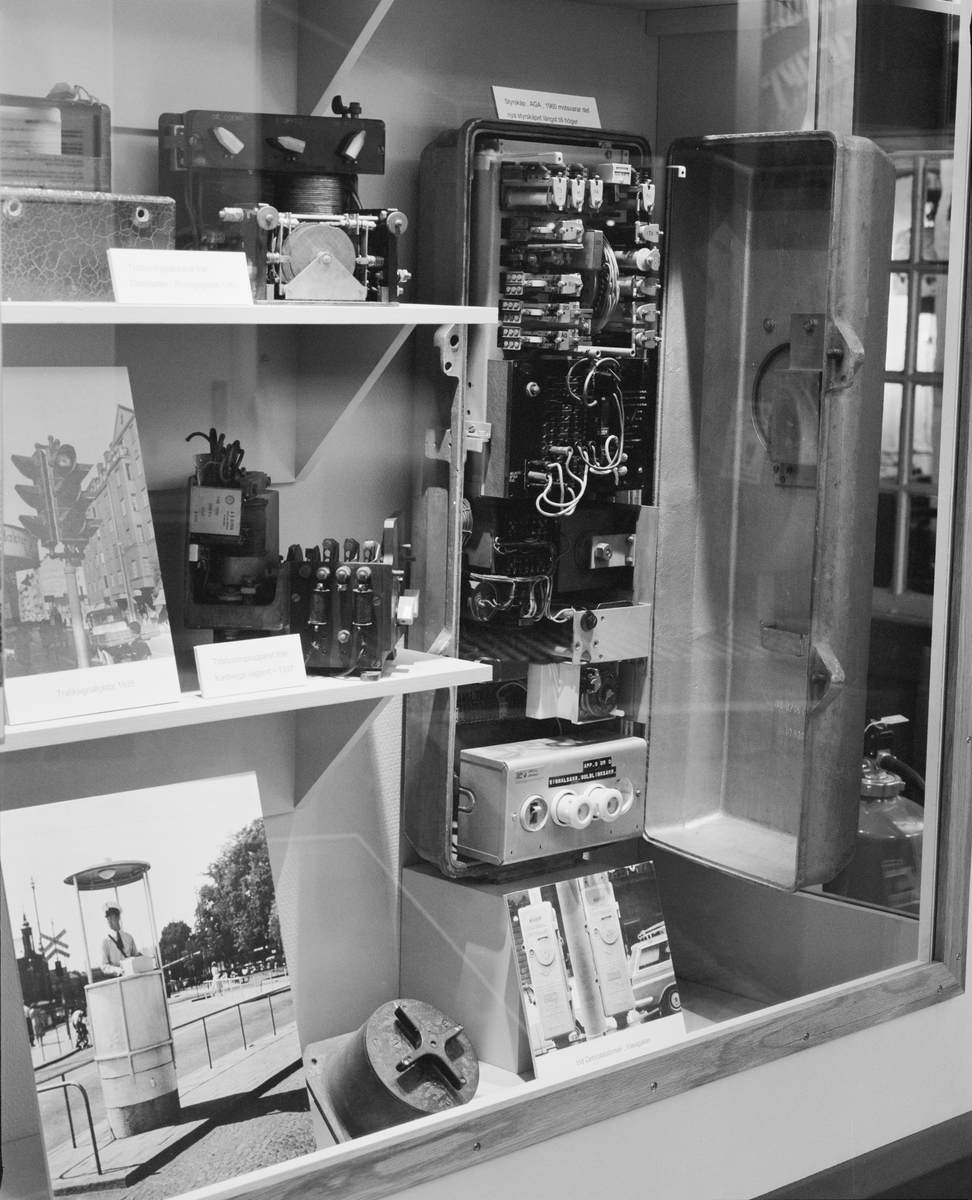 Dokumentation av utställningen "Tunnelbanetorget", Elkraftsmuseet. Monter med den historiska apparattekniken. Apparater för att sköta trafikljusen.
