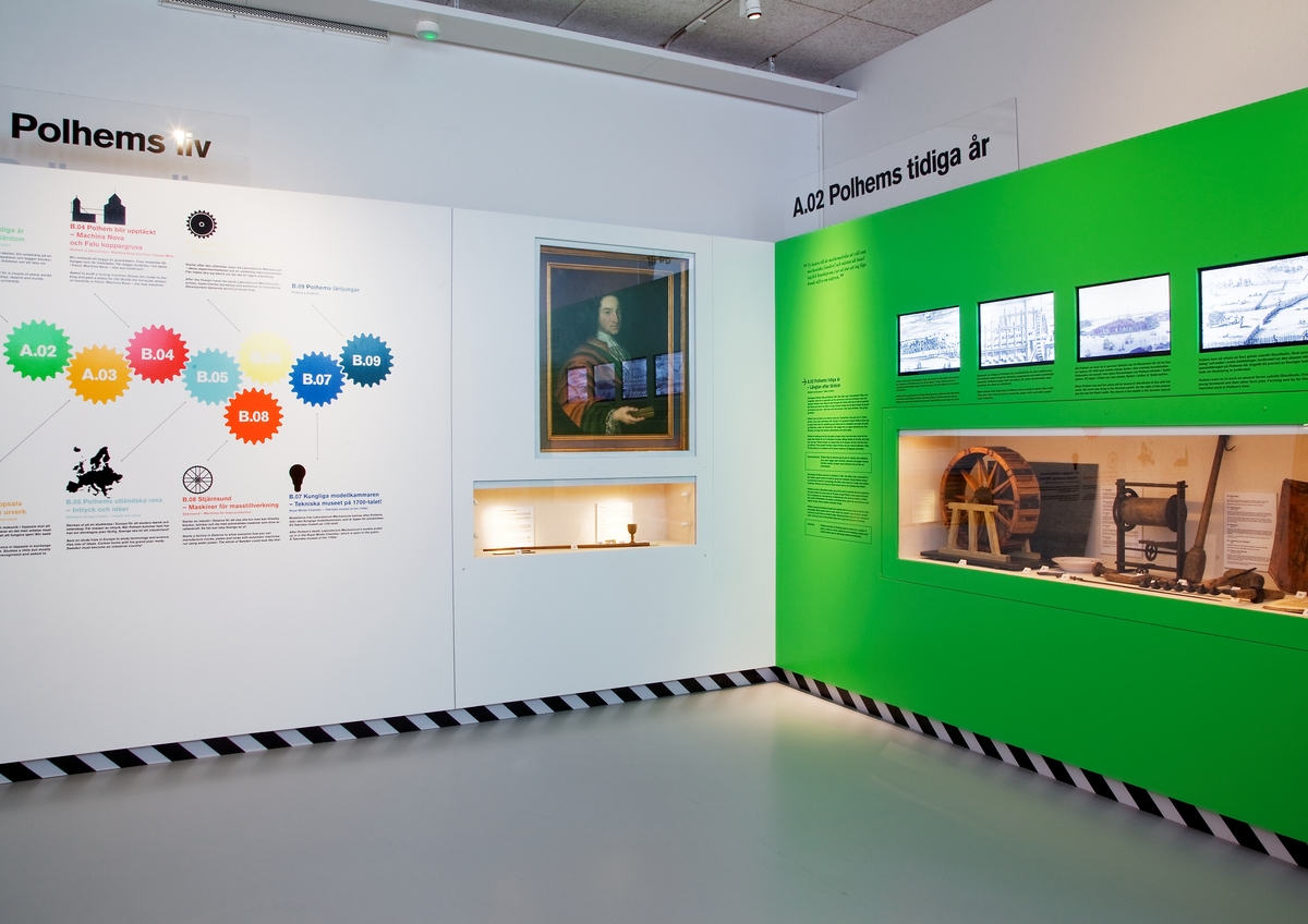 Titel: Christopher Polhem tillbaka till framtiden En utställning om uppfinnaren, entreprenören och universalgeniet Christopher Polhem. Utforska vår spännande utställning om en man som ansåg sig vara född vid fel tid och på fel plats. Utgångspunkten för berättelsen är Christopher Polhem som ung. Ett annat spår är hans egna ord om att vara född i fel tid och på fel plats, där vi beskriver orsakerna till varför hans idéer aldrig fick de genomslag som han hoppats på. Många gånger revolutionerande idéer som idag är världsledande lösningar, men som världen inte var redo för då. Utställningen resonerar också kring frågan om vad Polhem hade ägnat sig åt om han levt idag. Vad hade han sett som vår tids största utmaningar? Vilka hinder finns idag för framsynta innovatörer att genomföra sina idéer? Utställningen Christopher Polhem tillbaka till framtiden visas tills vidare. Utställningen visar unika föremål som Christopher Polhem använde integrerat med vår moderna multimedia och interaktivitet och där ledorden är rörelse, tvärvetenskap, lekfullhet, konst och framtidstro.