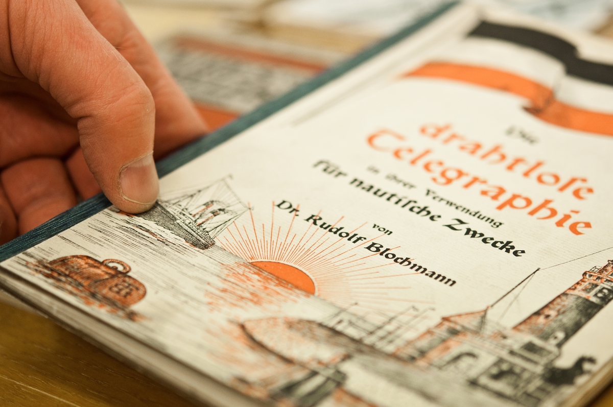 Bild från arbetet i biblioteket med den telehistoriska samlingen: Die drahtlose Telegraphie in ihrer Verwendung für nautische Zwecke av Rudolf Blochmann (Leipzig/Berlin, 1903).