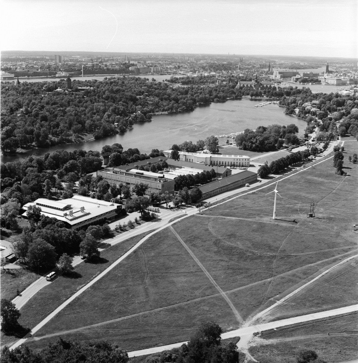 Vy från Kaknästornet över Tekniska Museet och Telemuseum. I bakgrunden syns Statens Sjöhistoriska museum.