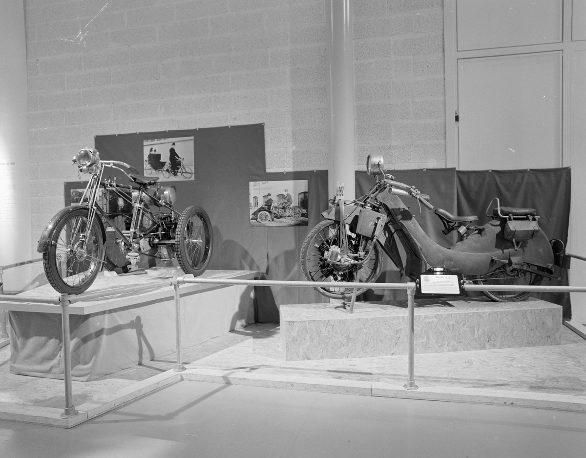 Dokumentation av "Motorcykeln 100 år" i Wallenberghallen. Motorcyklarna De Dion 1899 och Megola.