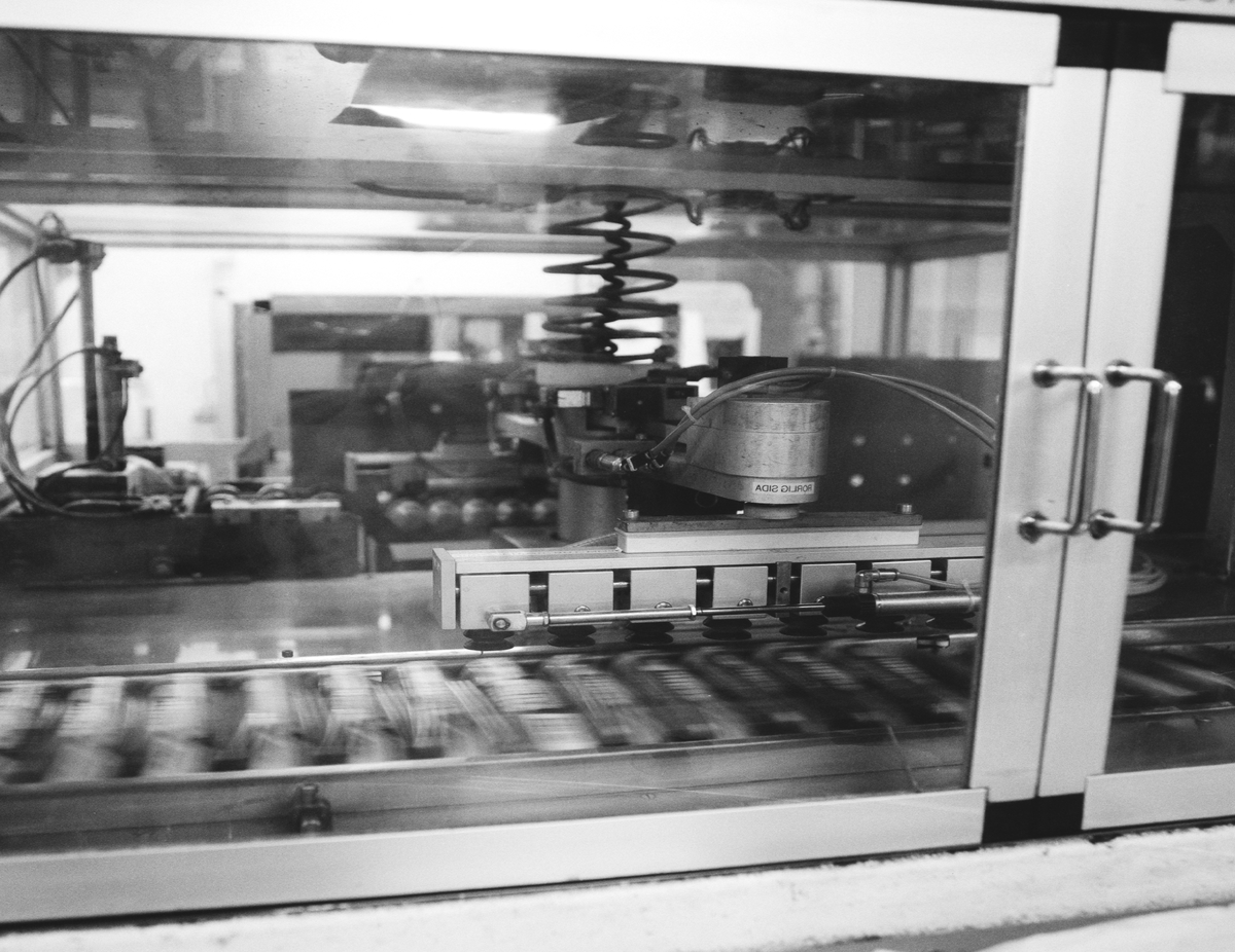 Genom plexiglasrutan syns tuberna i rörelsen. Circa 130 tuber i minuten packas av den här FLODAB-maskinen. Ett packlager hänger i sugkopparnas grepp och är på väg ned i en kartong Kalles 190 g.