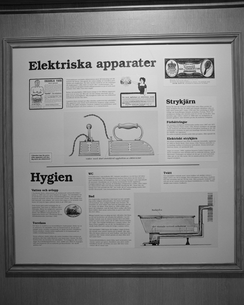 Dokumentation av utställningen "Teknikens under för 100 år sedan", Elkraftsmuseet. I text och bild illustreras Elektriska apparater.