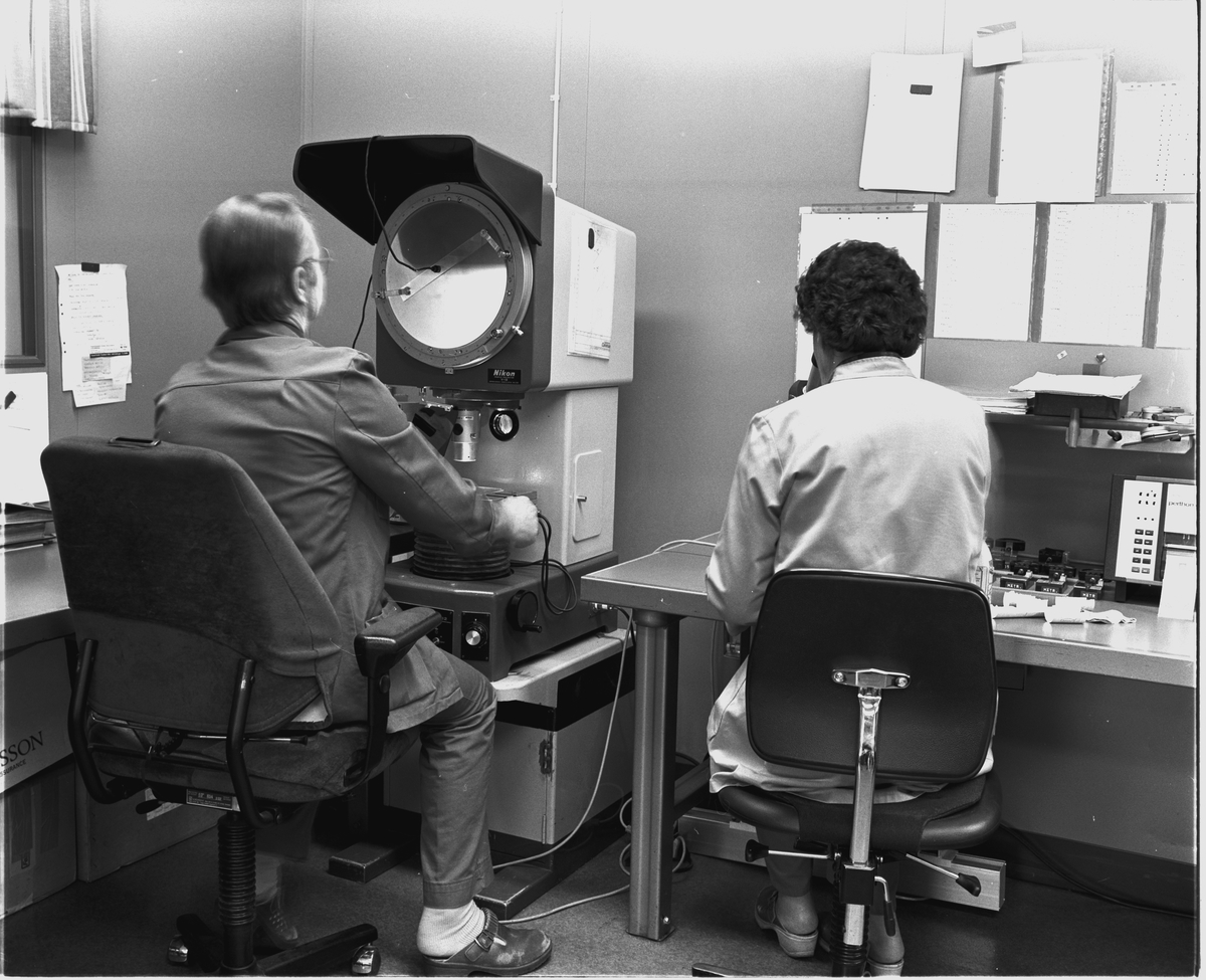 MÄTRUM V77 Bilden visar interiör i mätrummet där uppmätning och kontroll pågår. Bl.a. användes profilprojektor och mikroskåp. >>