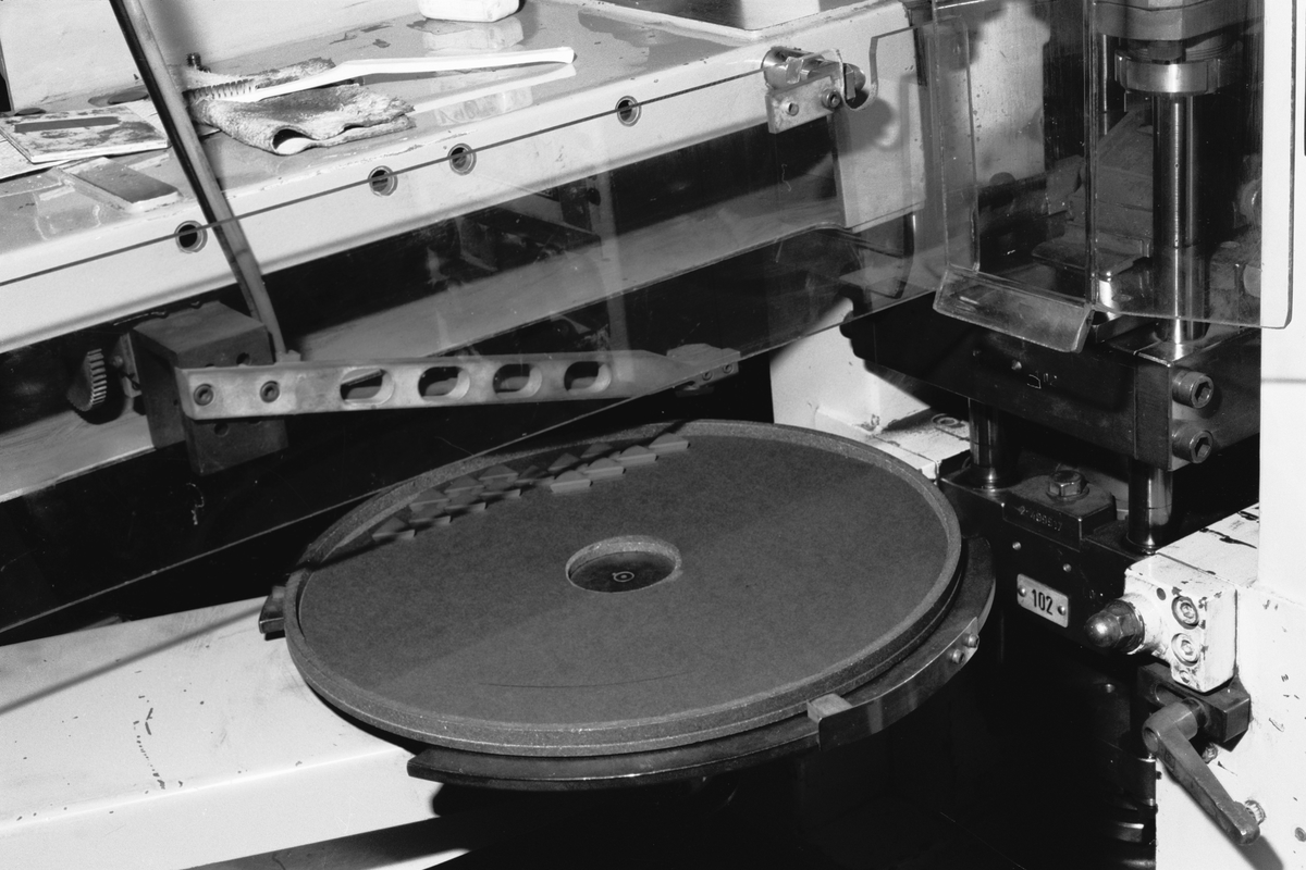 BLÄCKSTRÅLEMÄRKNING. Skären har tömts ur magasinen och placerats på arbetsbordet. >>