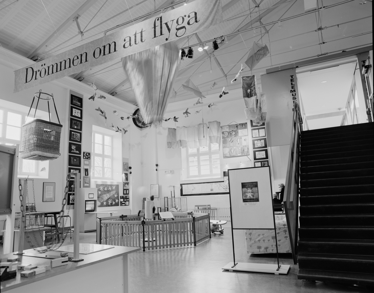 Utställningen "Drömmen om att flyga", ett samarbetsprojekt med Louiselundskolan och Nybrohovsskolan i Stockholm, där barnens arbeten ställdes ut på Teknorama, tillsammans med tillhörande flygexperiment. >> Interiör. Utställningshörnan med diverse flygexperiment och målningar från skolorna.