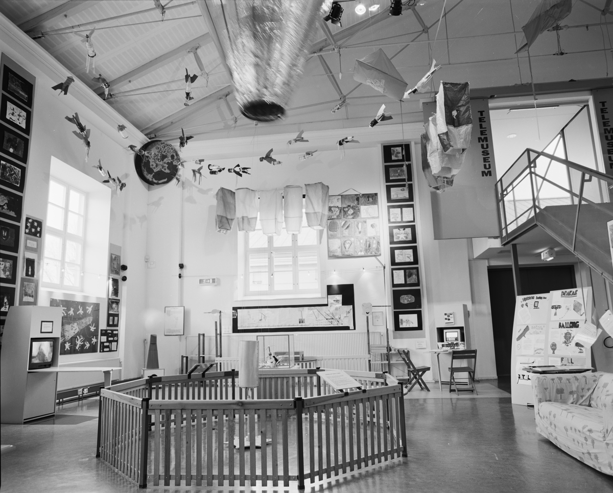 Titel: Utställningen "Drömmen om att flyga", ett samarbetsprojekt med Louiselundskolan och Nybrohovsskolan i Stockholm, där barnens arbeten ställdes ut på Teknorama, tillsammans med tillhörande flygexperiment. >> Interiör. Utställningshörnan med diverse flygexperiment och målningar från skolorna.