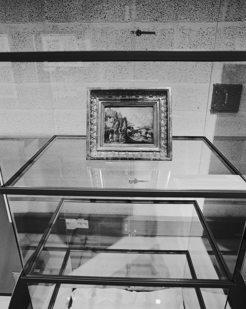 "Vallonien på Louis De Geers tid och idag" utställningen. Monter. Oljetavla, landskap med personer.