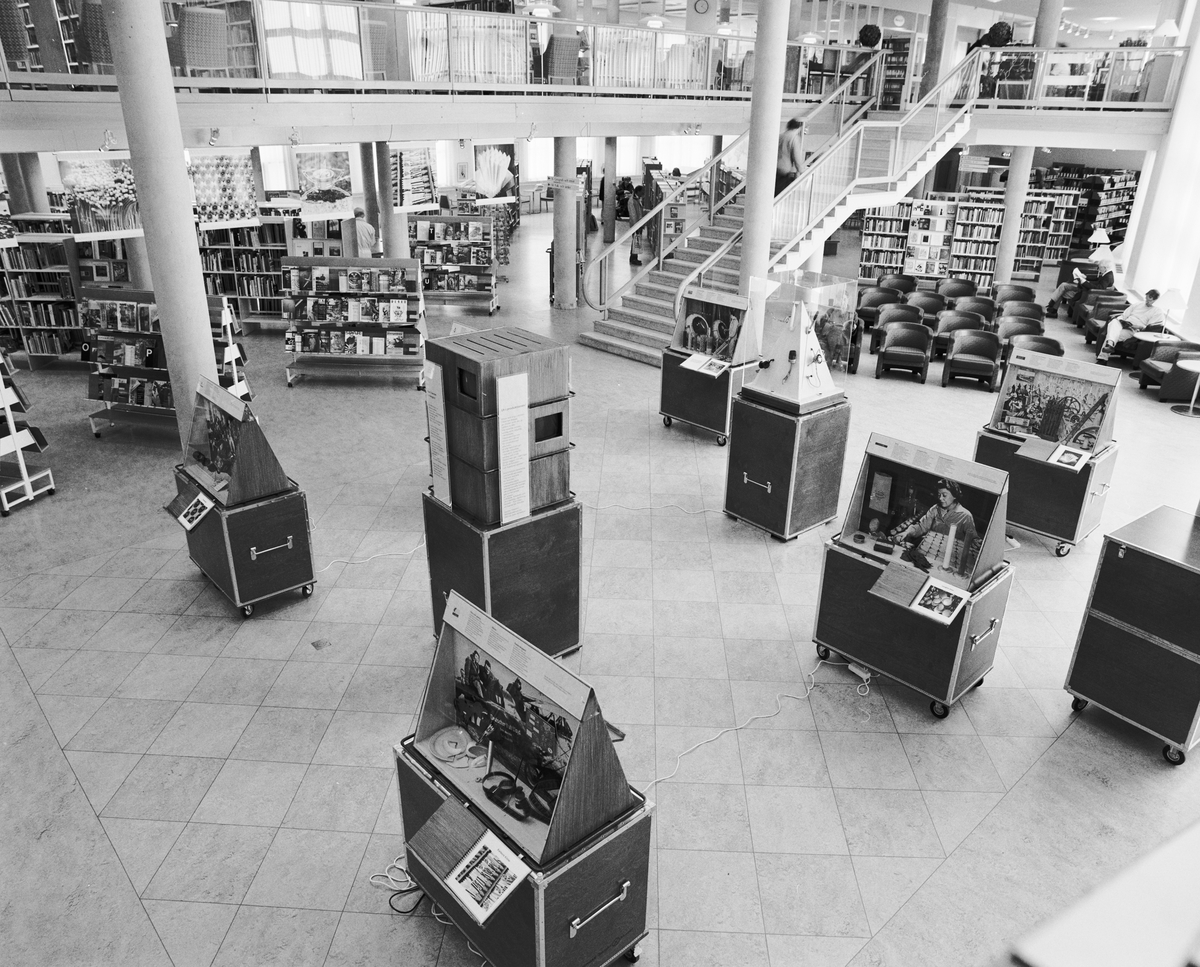 Dokumentation av den lilla utställningen av "Kulor, Krus och Kaviar". Sätts upp på Västerås stadsbibliotek. Vandringsutställning. Samarbete mellan Tekniska museet och Riksutställningar. Interiör. Monter på hjul.