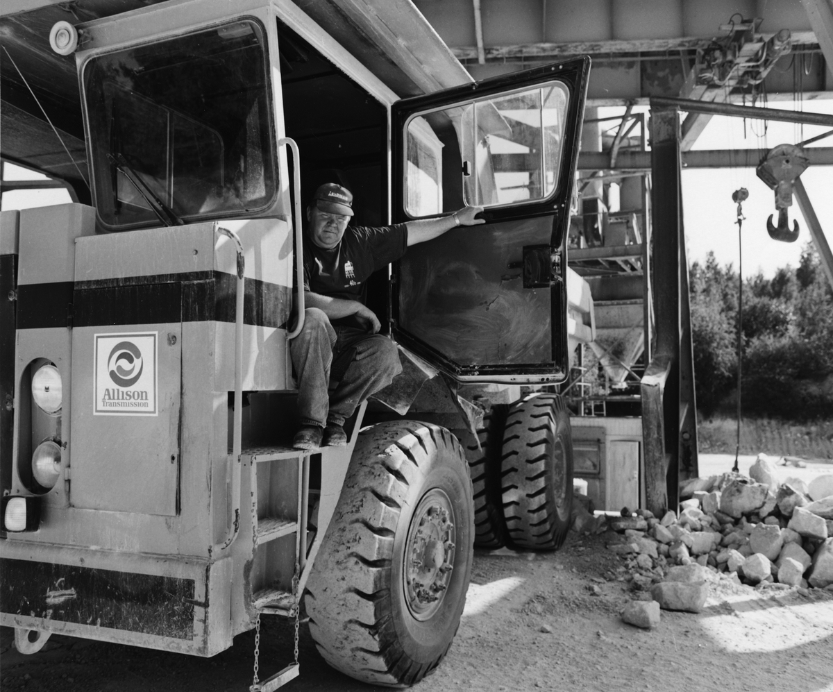Kalklinbanan Forsby - Köping. Truckförare Kjell Ragnarsson väntar på att få tippa sten i krossen.