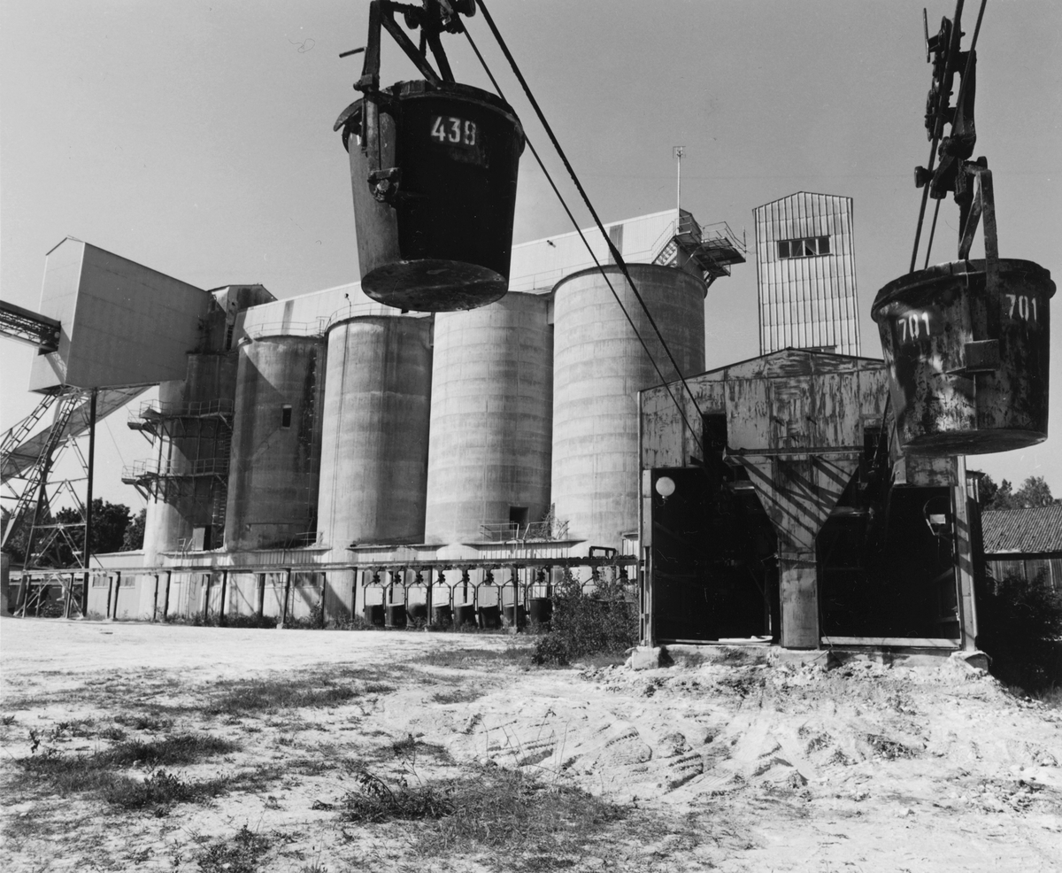 Kalklinbanan Forsby - Köping. T.v. siktstation, silon och spännstation och linbanevagnar i förgrunden.