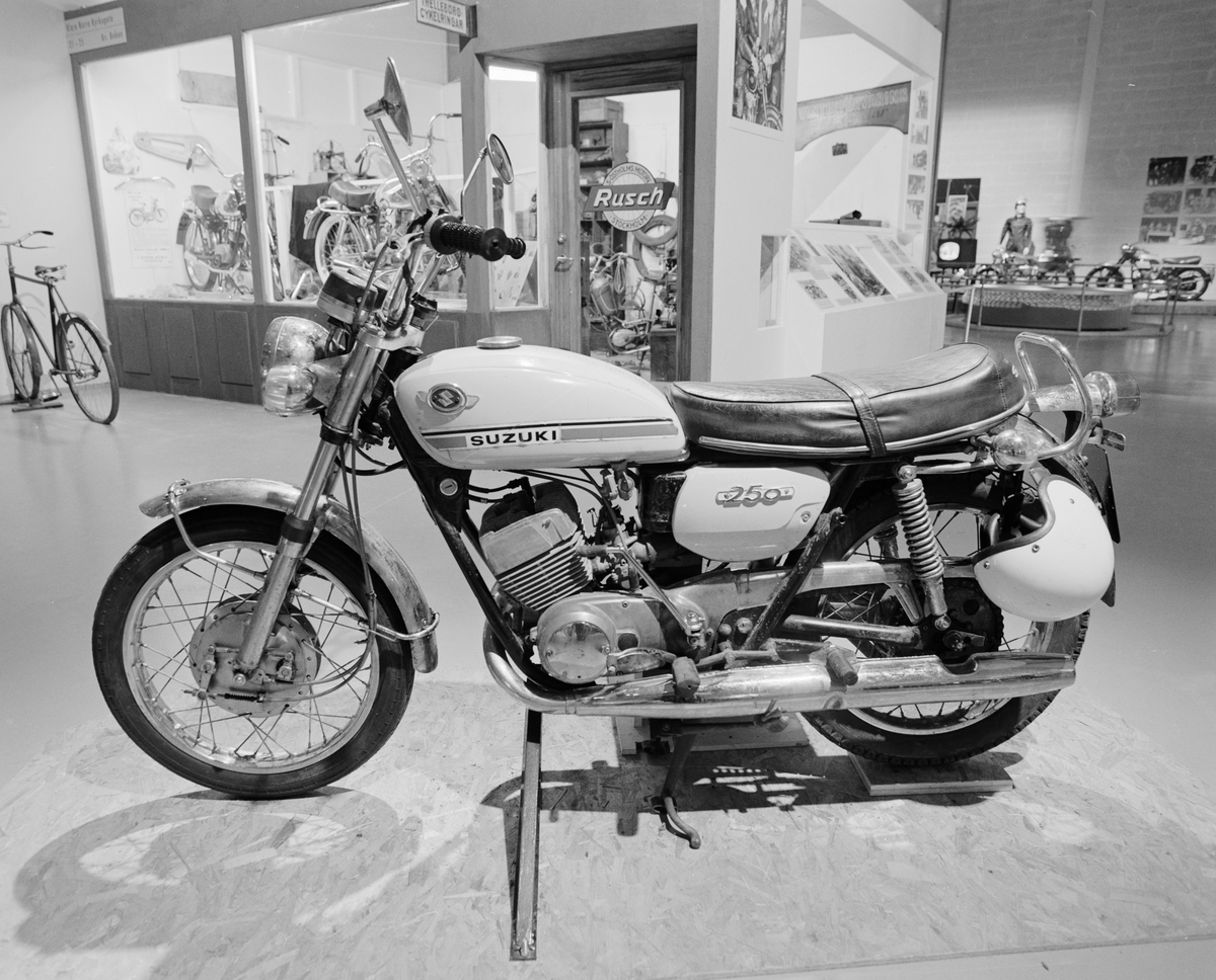 Dokumentation av "Motorcykeln 100 år" i Wallenberghallen. Suzuki 250 cc.