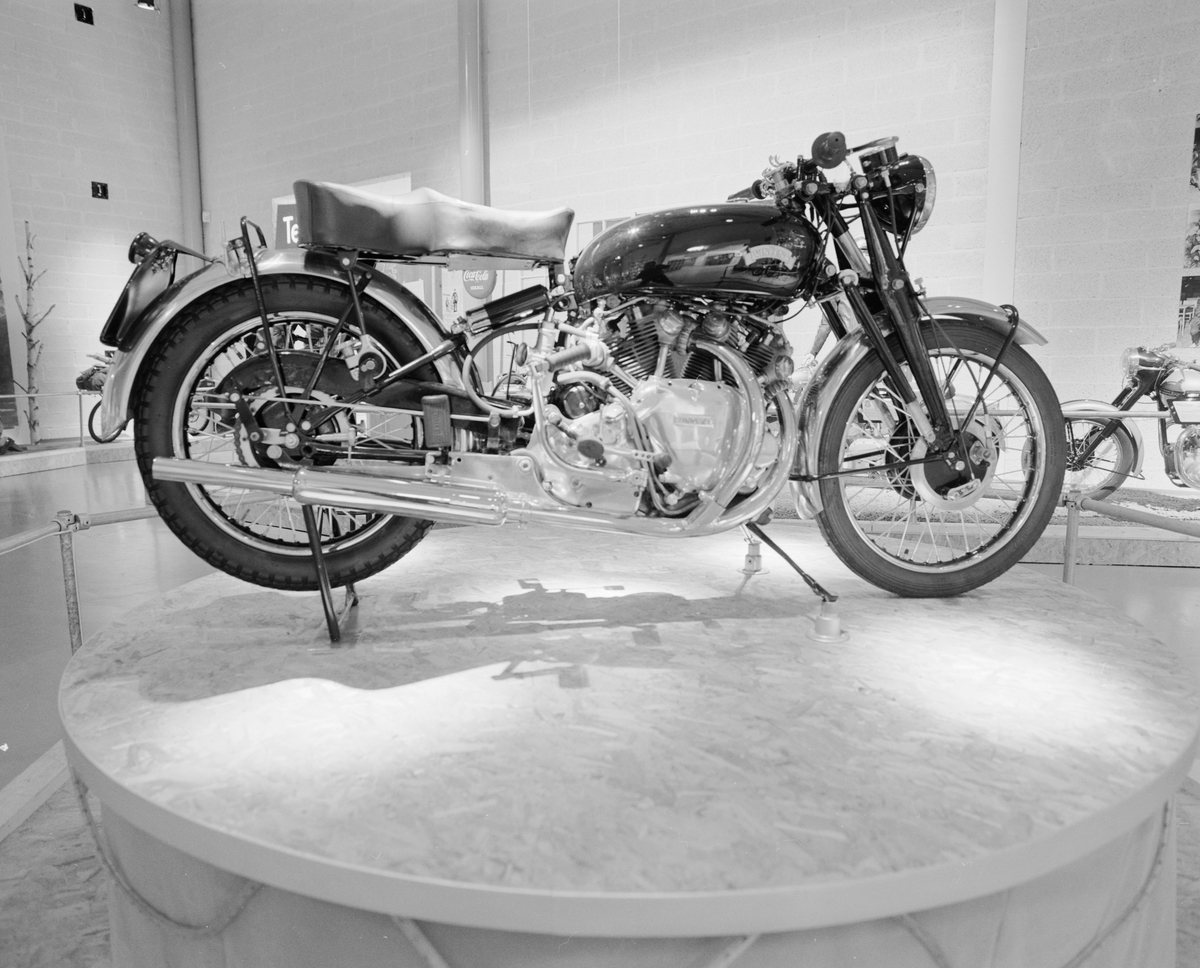 Dokumentation av "Motorcykeln 100 år" i Wallenberghallen. Motorcykel, Vincent.