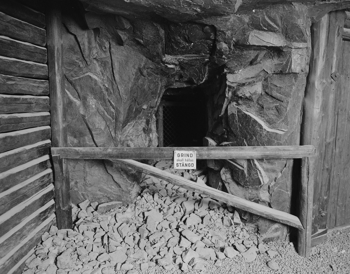 Dokumentation av Gruvutställningen. Tredje rummet: Gruvort med stängd grind.