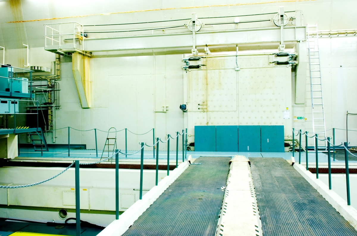 Bilden föreställer: Plan 26 RB rum nr. 2606. Reaktorhall mot vägg i väster med Laddrännan 2401 i förgrunden och över denna balkbron för transporter. Bakom detta syns innre slussport mot transportgångrn. Förklaring av system framgår av rapport :Statens Vattenfallsverk A23/60 5/4 1960.