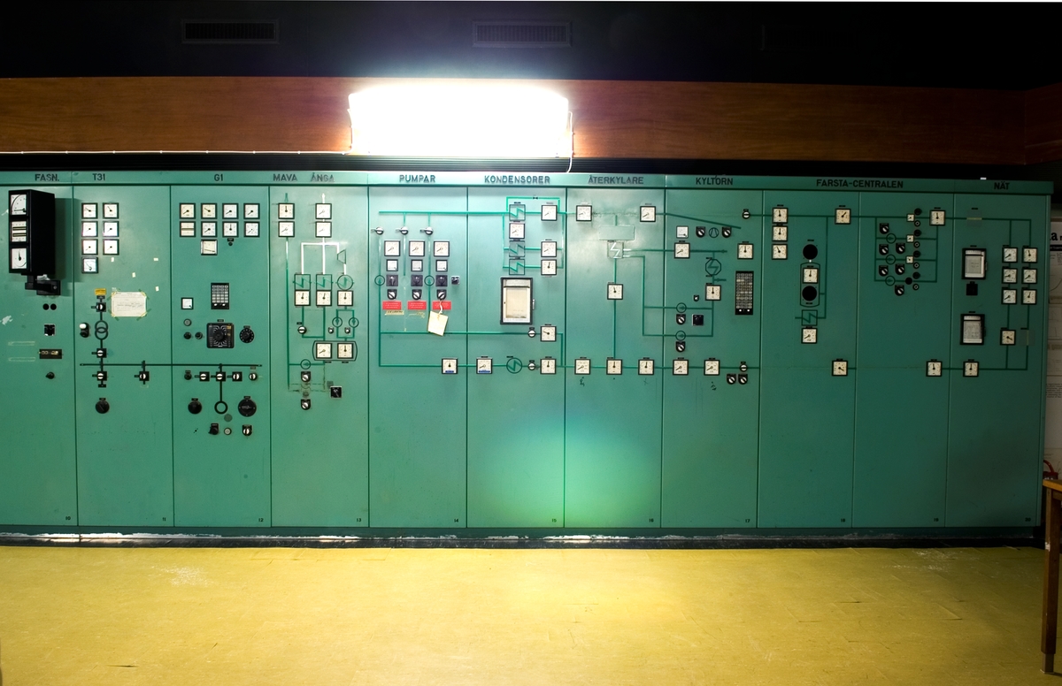 Bilden föreställer: Plan 6, kontrollrum 619. Panel för turbin, kondensor, kyltorn och Farsta centralen. Förklaring av system framgår av rapport :Statens Vattenfallsverk A23/60 5/4 1960.