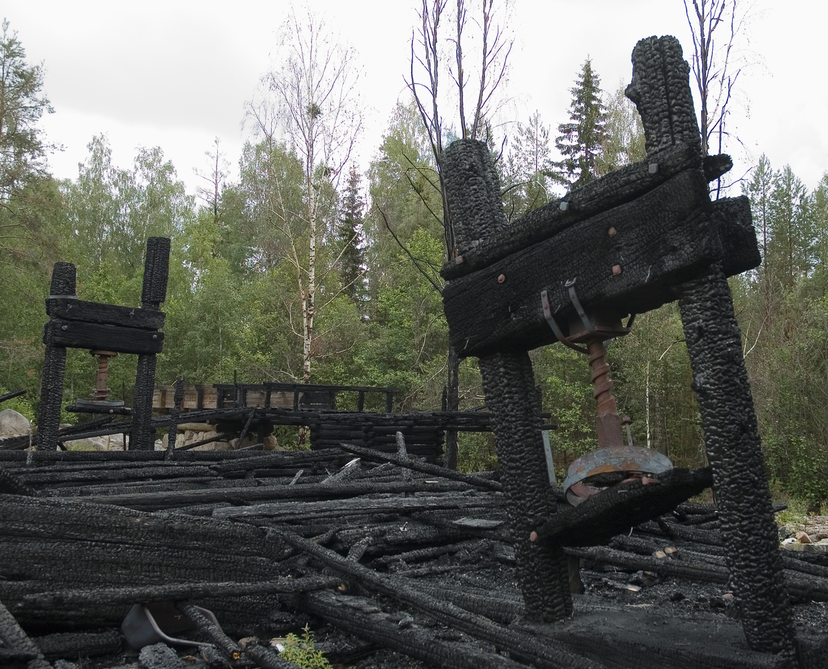 Brandplatsen med en av papperspressarna i förgrunden