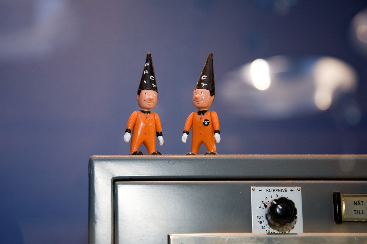 Facit karusellminne på It-ceum i Linköping. Ovanpå karusellminnet står 2 Facit- maskotar.