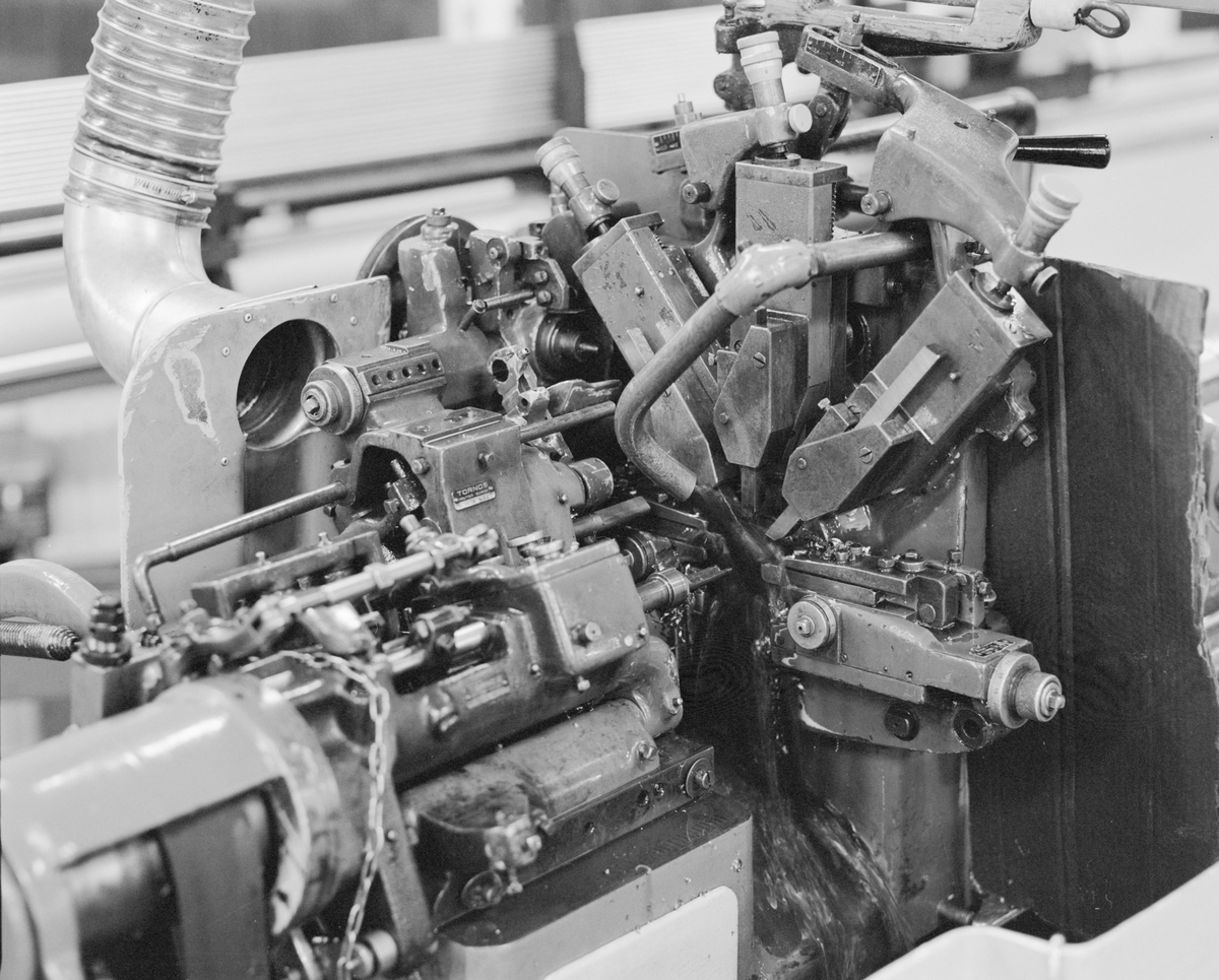 Äldre kurvstyrd längdsvarvningsauromat av fabrikat Tornos. Bilden visar slider och chuckar för bearbetningsverktyg.