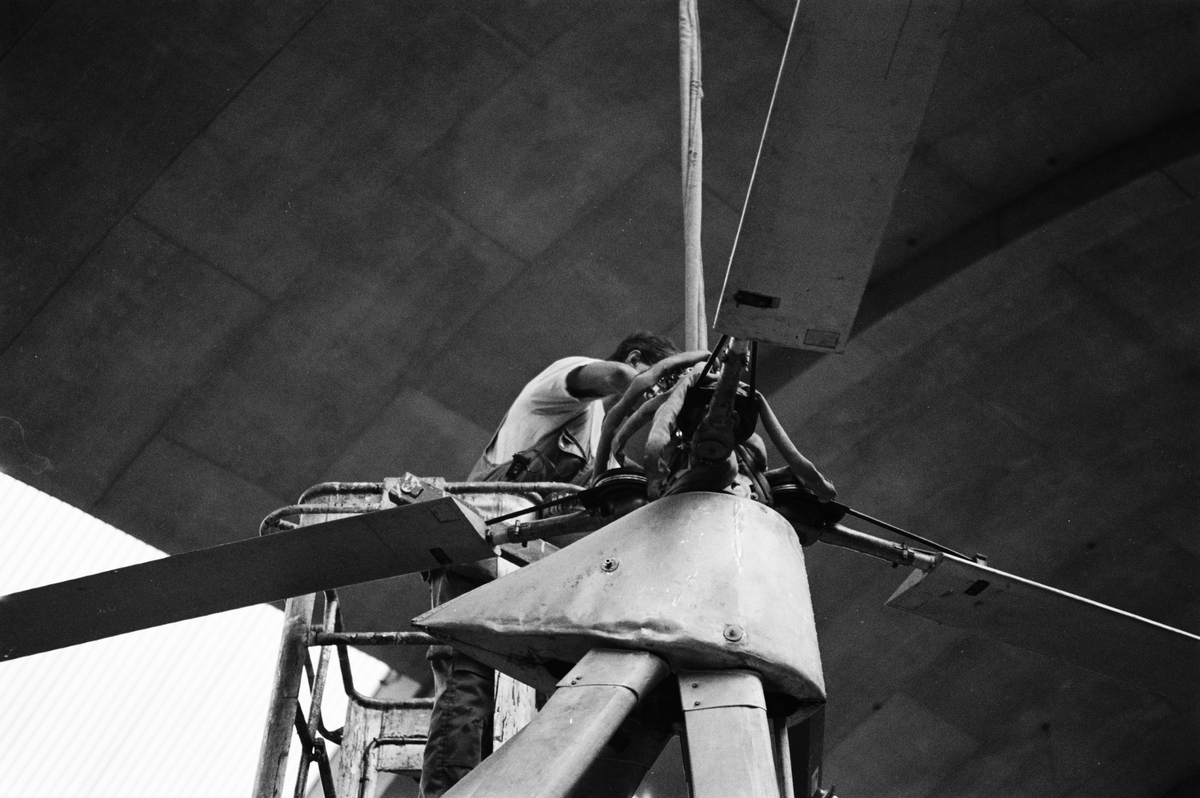 MASKINHALLENS UPPRUSTNING Peter Häll vid upphängningen av autogiron. >>