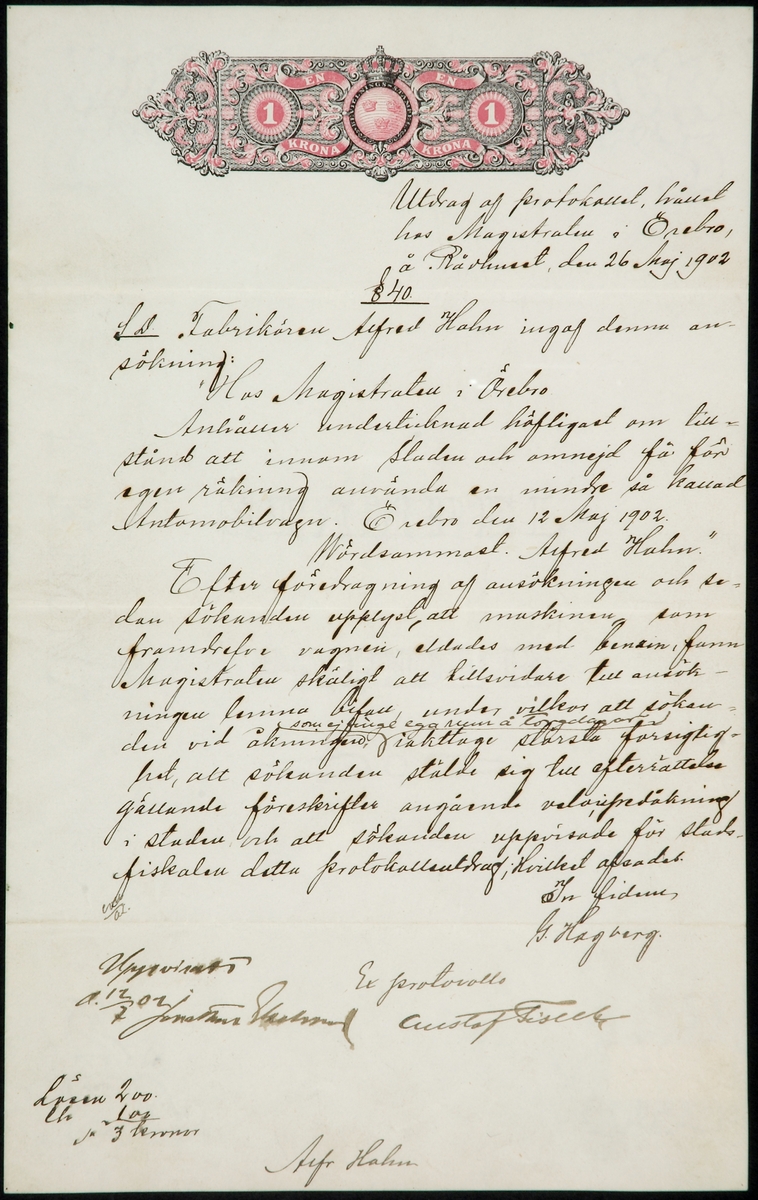 Sveriges första körkort. Utfärdat till Anton Hahn. Utdrag af protokoll, hållet hos Magistraten i Örebro å Rådhuset, den 26 Maj 1902.