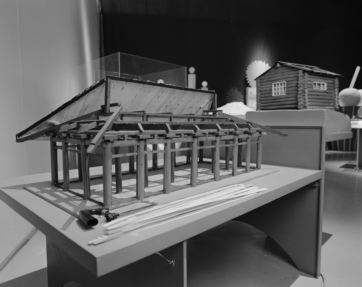 Utställningen "Teknik som talar alla språk". Bostäder från hela världen, av Hanna, Sofia, Ximena och Kalle 9 A, Bagarmossens skola.