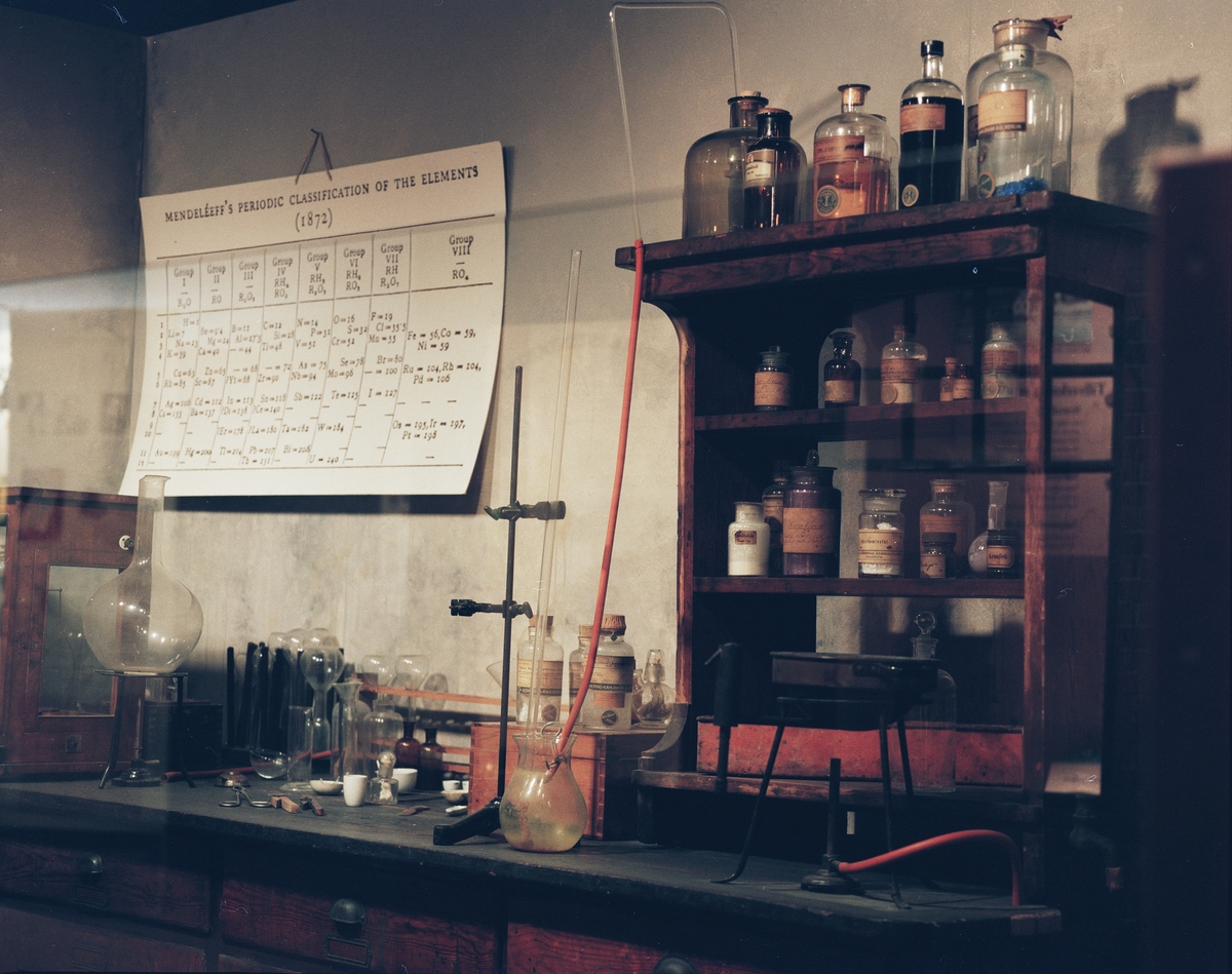 Bilder för Tekniska museets hemsida. Kemilaboratorium från sekelskiftet i "Kemiutställningen".