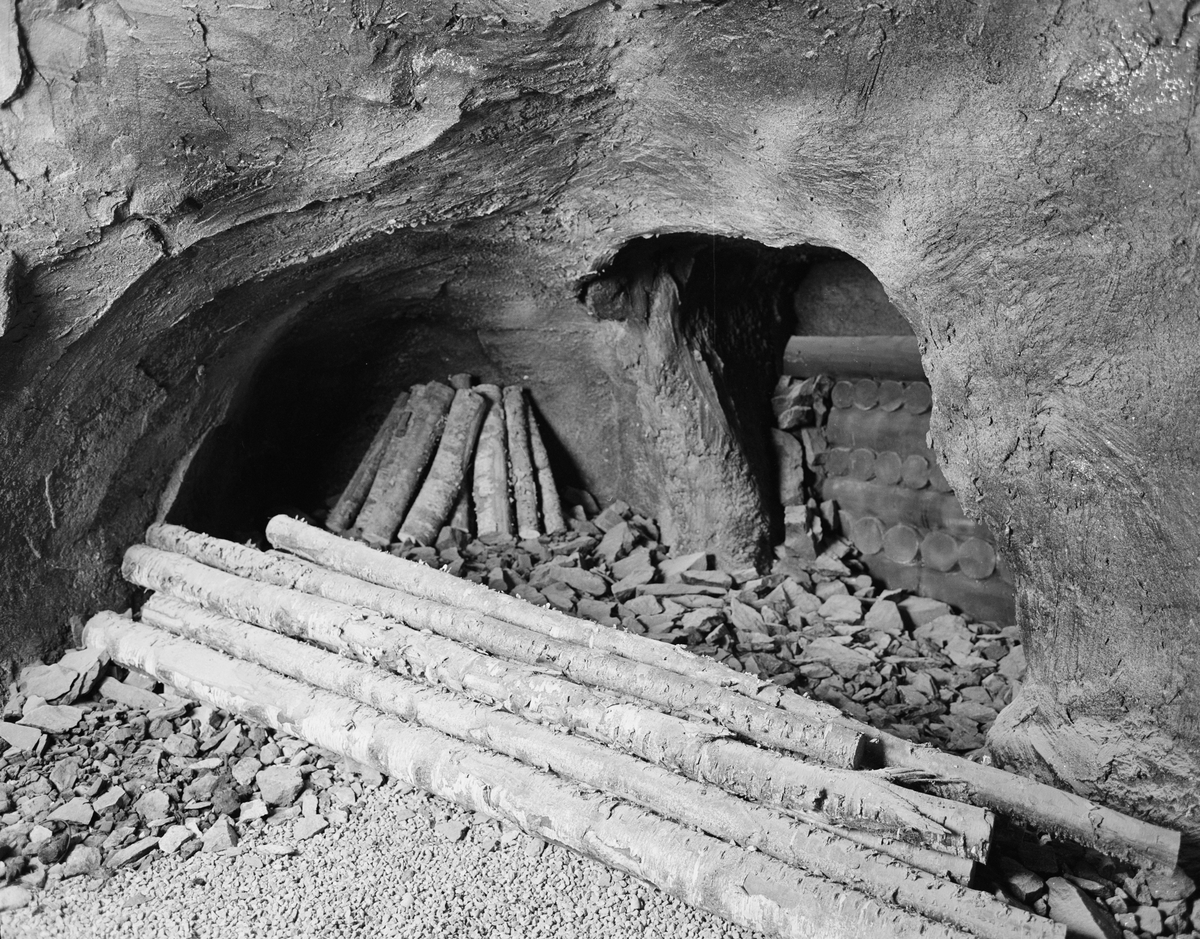 Dokumentation av Gruvan. Första rummet: "Tillmakning (metod att spränga i gruvor) och lastning med ved och eld".