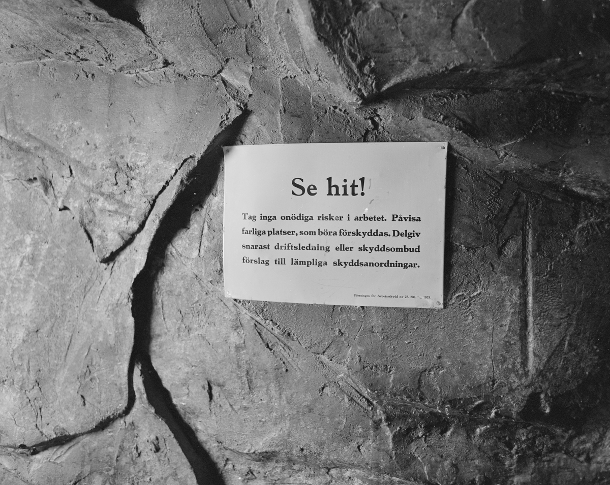 Dokumentation av Gruvutställningen. Varningsskylt om risker i arbetet.