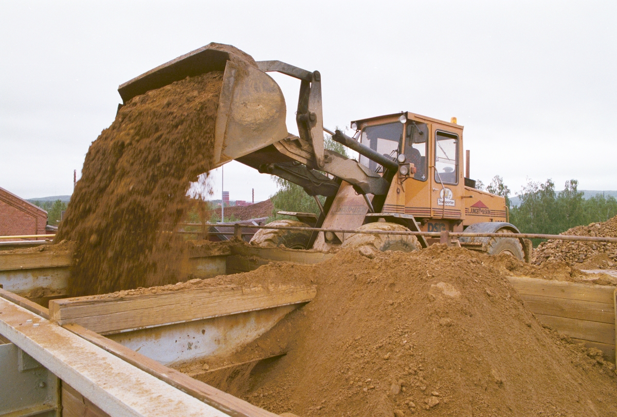 Schaktmaskin fyller råvara i fickorna, där råvaran transporteras vidare in i slammeriet.