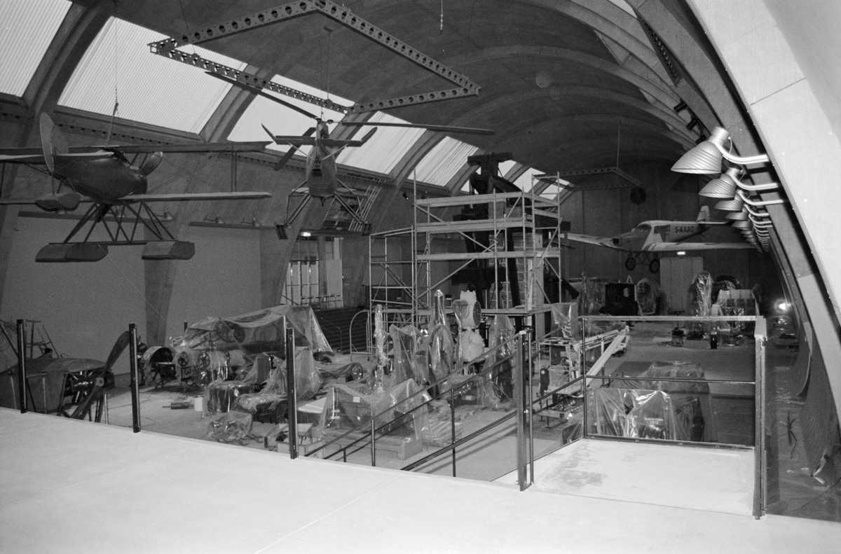 MASKINHALLENS UPPRUSTNING Översiktsvy från flyghyllan. Belysningsgondoler och stag uppmonterade. Arbetet utfördes av scenteknik. Kopior av ursprungliga Zeiss-armaturer på plats. Levererades av Annell Ljus och Form. Ansvariga för projektering av hyllans belysning var Ljus och Design AB, Stefan Viktorsson och Jan Gouiedo. Vintern 1996. >>