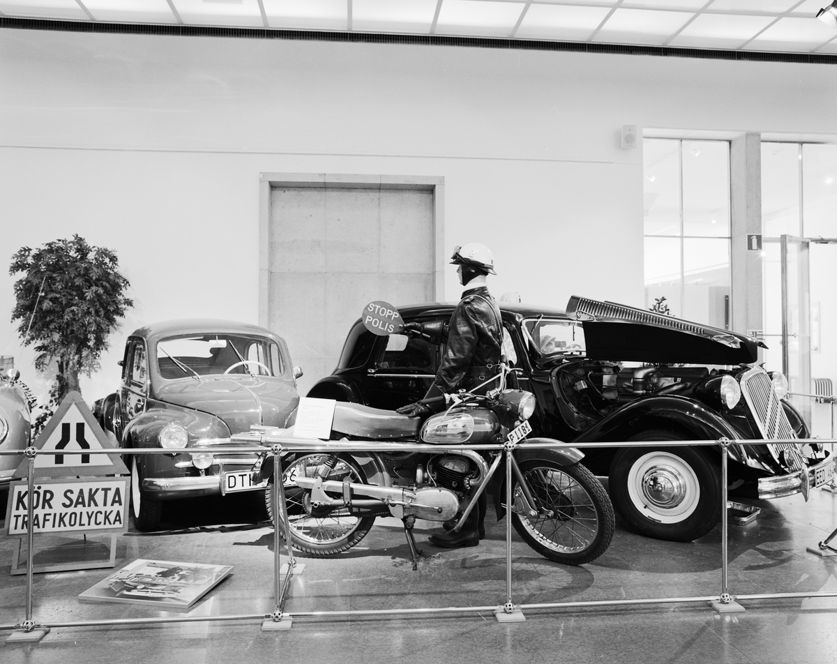 Dokumentation av "Automobilhistoriska klubben" utställningen, Sverige- salen. Husqvarna motorcykel 281 sport 1956, Citroën B15 1951, Renault 4cv och docka med 50-tals kläder.
