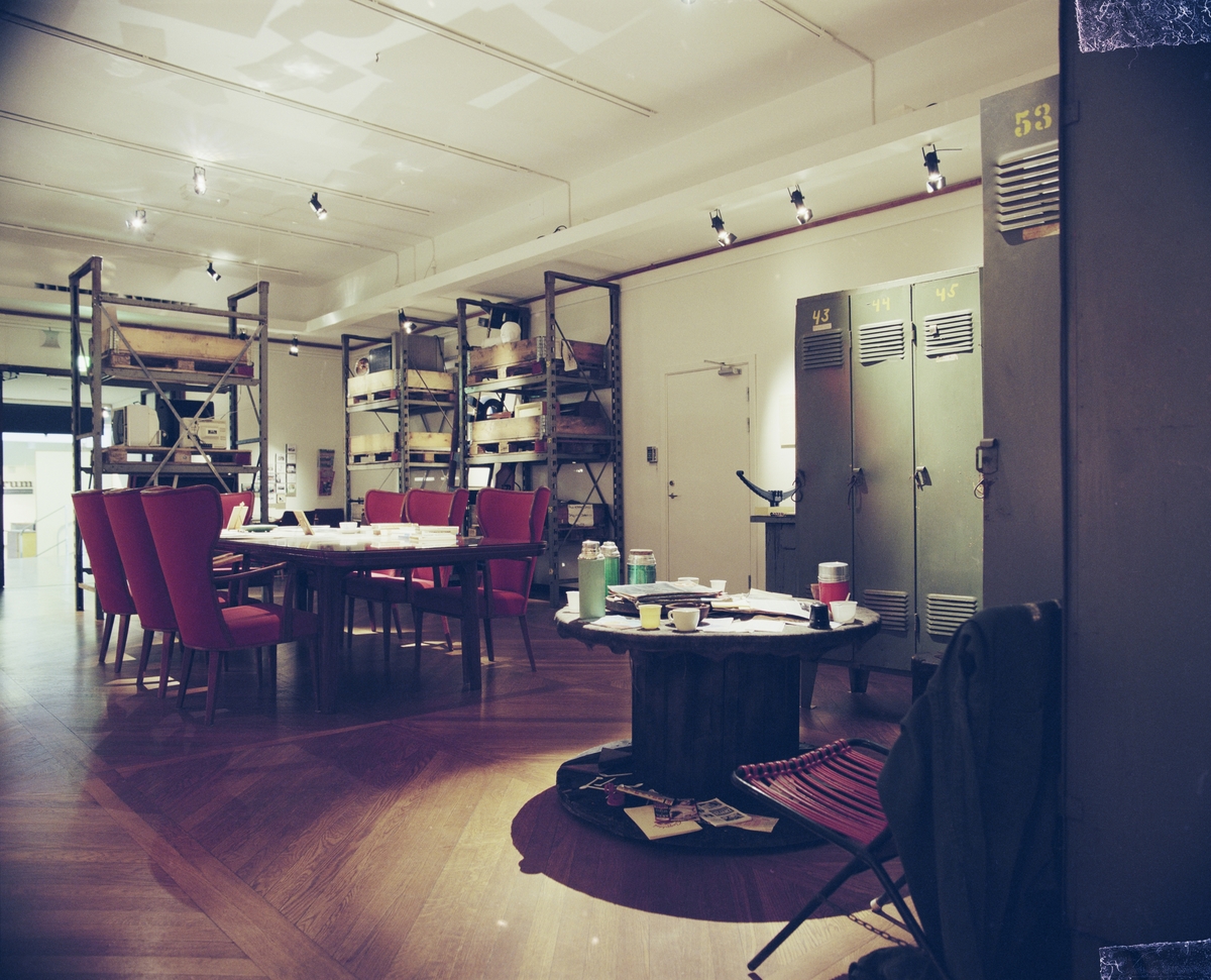 Lesjöfors bruks styrelsesammanträdesbord. I förgrunden klädskåp och trådrullebord som är dukat för kafferast.