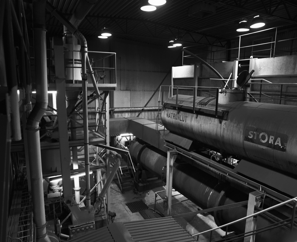 Rödfärgshyttan sedd uppifrån. Tanken märkt med STORA, innehåller natronlut för rening av rökgaser.