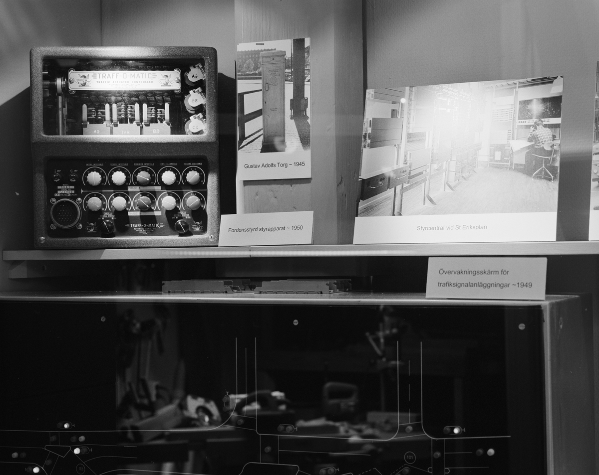 Dokumentation av utställningen "Tunnelbanetorget", i Elkraftsmuseet. Monter med den historiska apparattekniken. Apparater för att sköta trafikljusen.