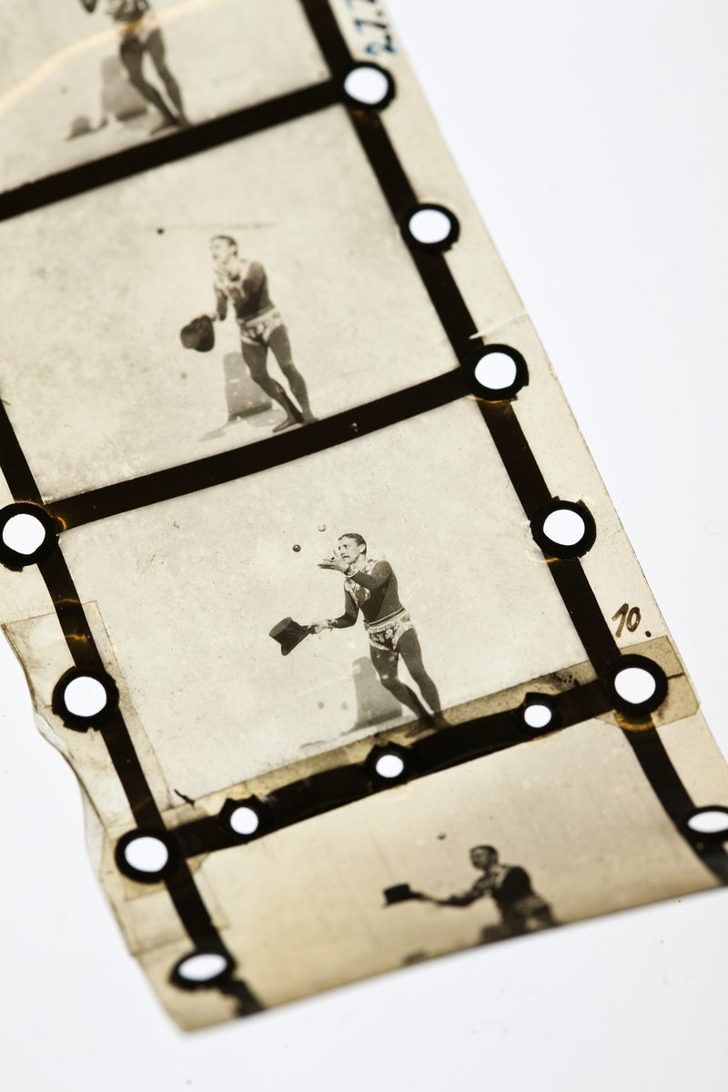Den längre filmbiten (12 bilder ur filmen "Das boxende Känguruh" med "Mister Delaware" maj 1895) har hålen numrerade 106-128 med bläckskrift och skarv mellan nr. 112 och 114.