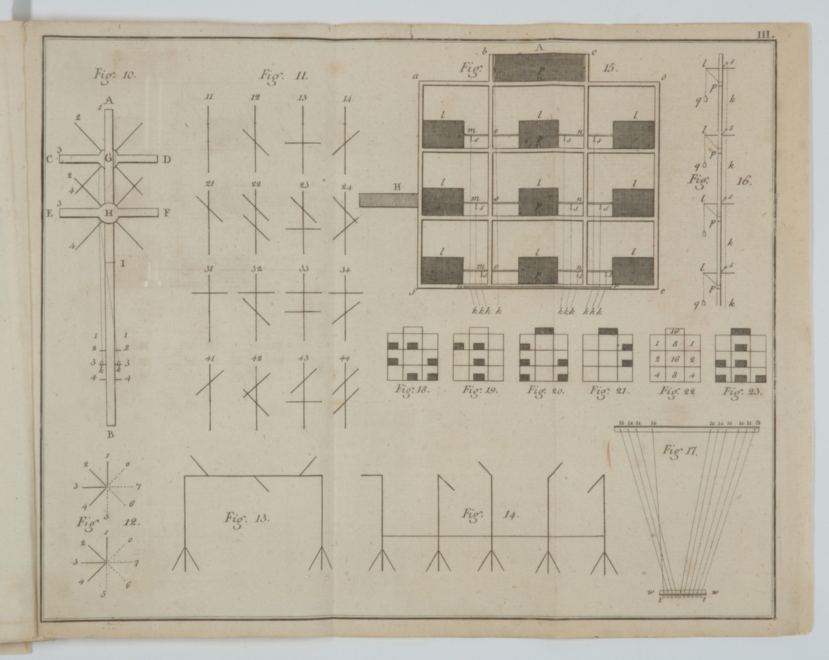 Det svenska optiska telegrafen där fig 15 visar systemet med luckor som ställs vertikalt och horisontalt.