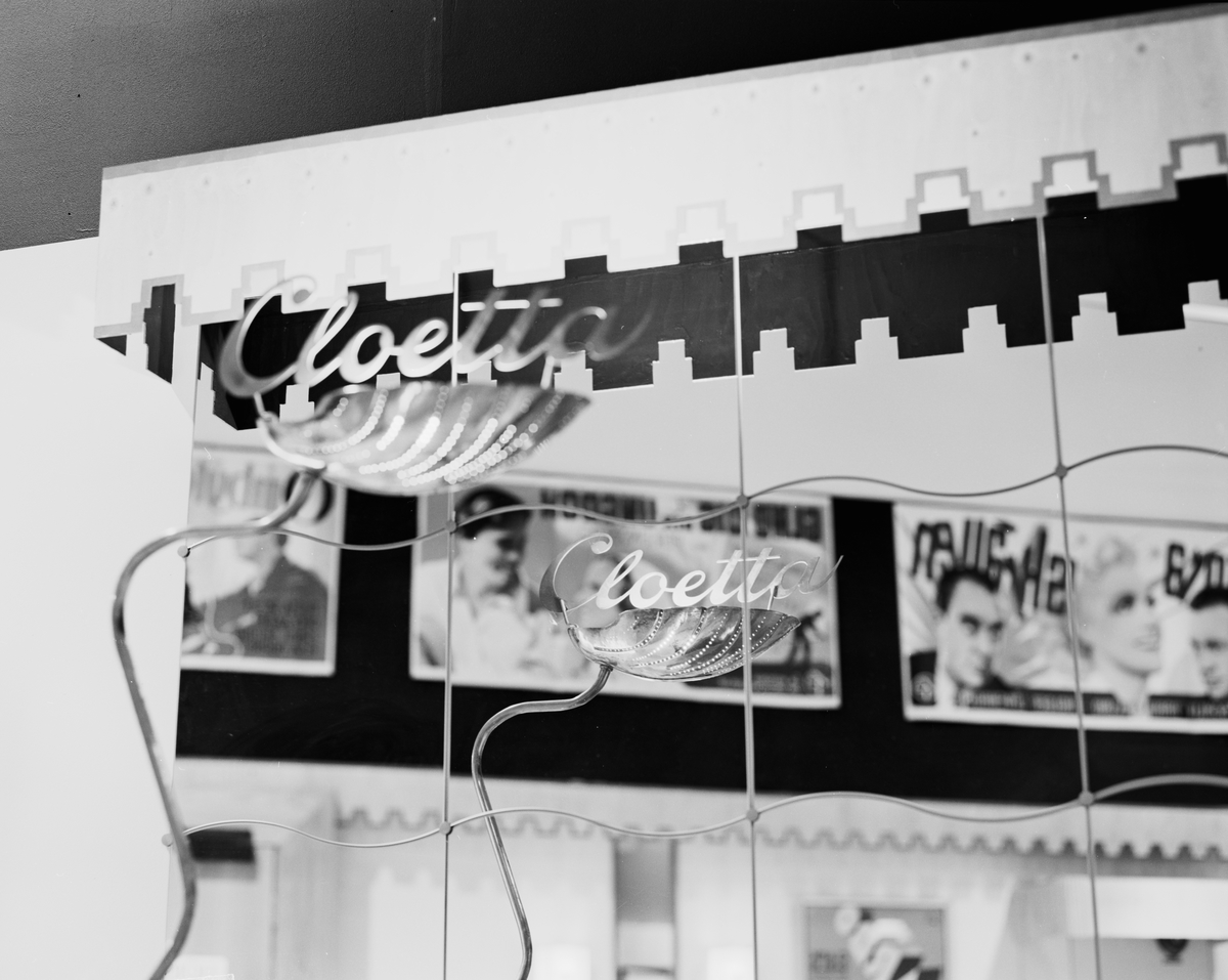 Spegelvägg (nodern) i "foajen". I förgrunden syns Cloetta-reklam-skylt, fastsittande på Choklad-disk i original. Inför filmen 100 år gjordes en utställning "Magiska Bilder komik, erotik,>> optik" den 26 april - 12 jan 1997. Producerad av Svenska Filminstitutet i samarbete med Telemuseum och Tekniska Museet. Formgivning Mikael Sylwan och ulrika Wolff. Idé och koncept Anna-Lena Wibom.