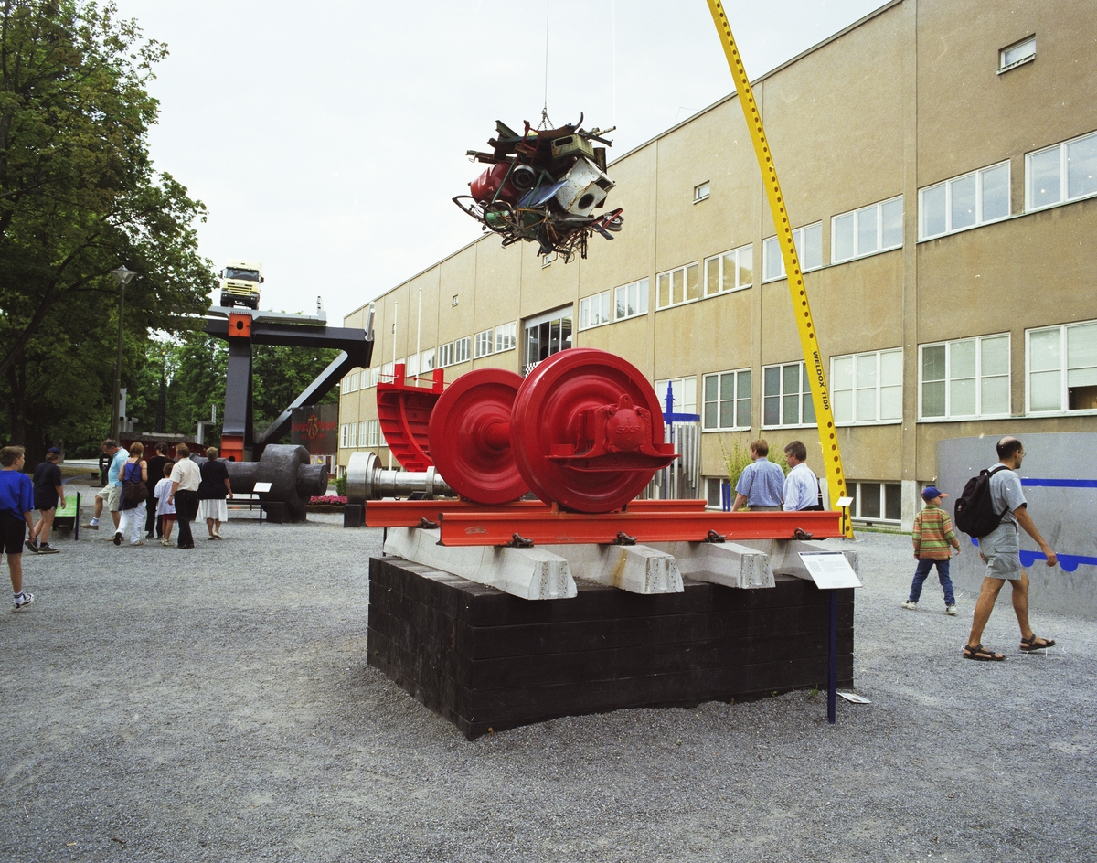 Utställningen "Stålets ansikte". Detalj av tågräls och Weldox-armen med hängande skrot, utanför Tekniska museets entré.