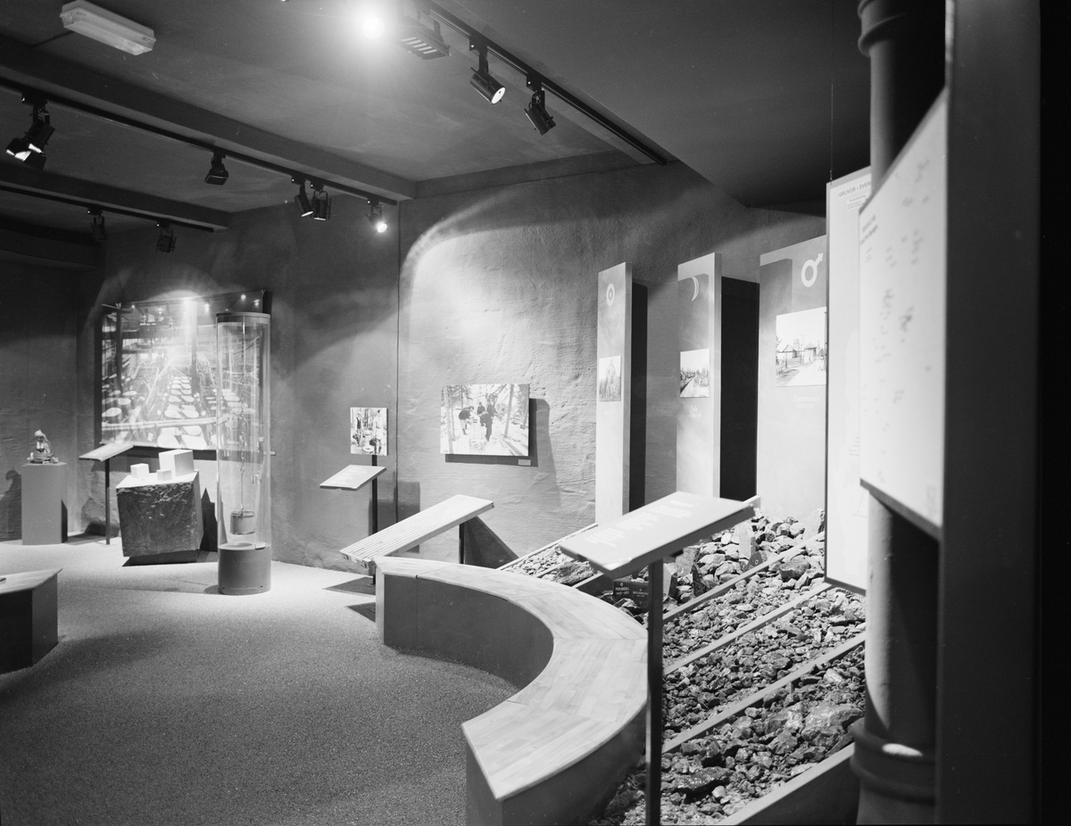 Dokumentation av Gruvutställningen. Sjunde rummet: Interiör. Planscher med en tunna i förgrunden.