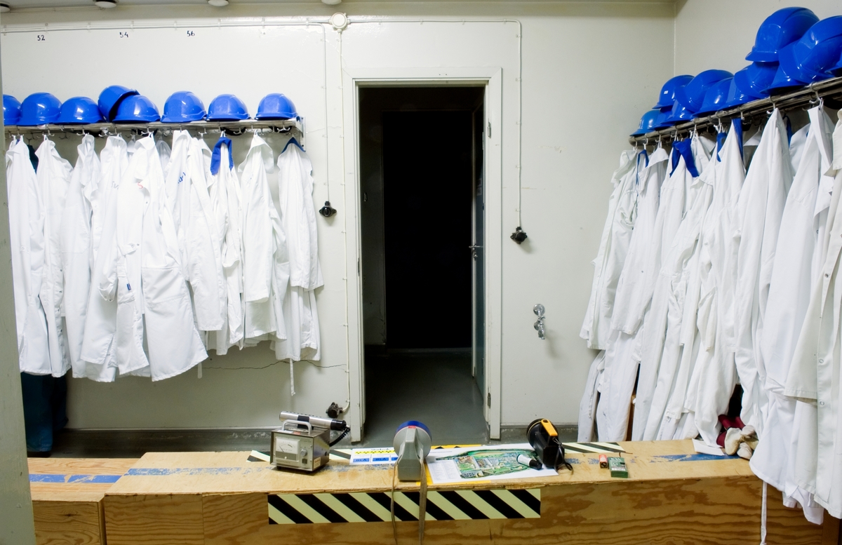 Bilden föreställer: Plan 6 KoS byggnaden rum 608. Omklädningsrum med personlig skyddsutrustning för personal i drift. Skogräns och dörr till rum 609 som är första tvättrum. Bilden tagen från rum 604. Förklaring av system framgår av rapport :Statens Vattenfallsverk A23/60 5/4 1960.