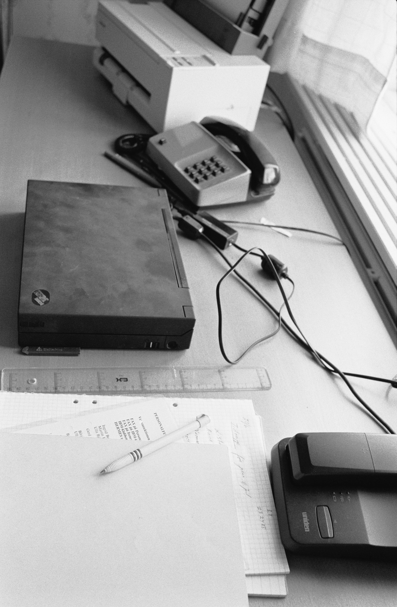Börje Ekmans arbetsbord och -maskiner/telefoner. Distansarbete intervju nr 21. >>