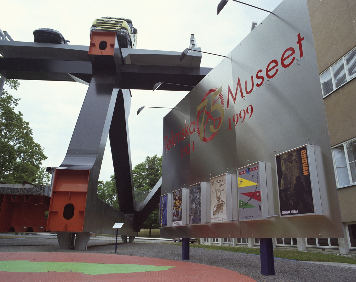 Utställningen "Stålets ansikte". Detalj av Öresundsbron med bil, utanför Tekniska museets entré.