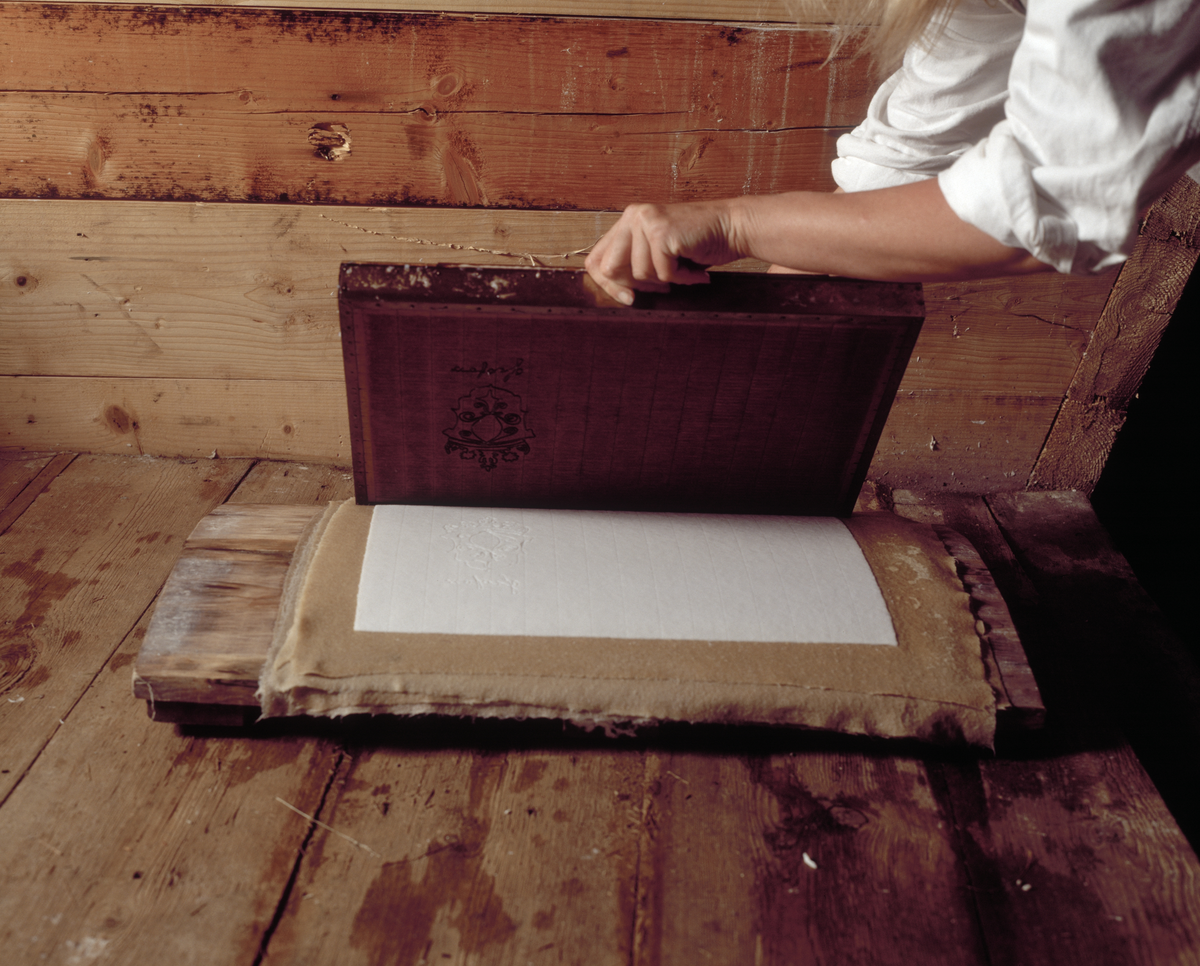 Ösjöfors. Sahn Gnista guskar av ett ark-överför det från pappersformen till en guskbräda. 1980-tal.