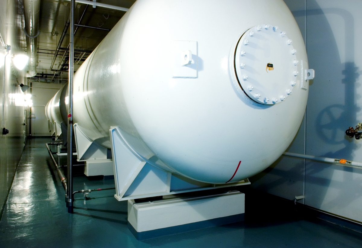 Bilden föreställer: Plan 10 rum 1019 D20 förådstankar. Tre stycken som vardera rymmer 25m3. Korridor mot rum 1019 där tre stycken 25m3 D2O förrådstankar är placerade. Förklaring av system framgår av rapport :Statens Vattenfallsverk A23/60 5/4 1960.