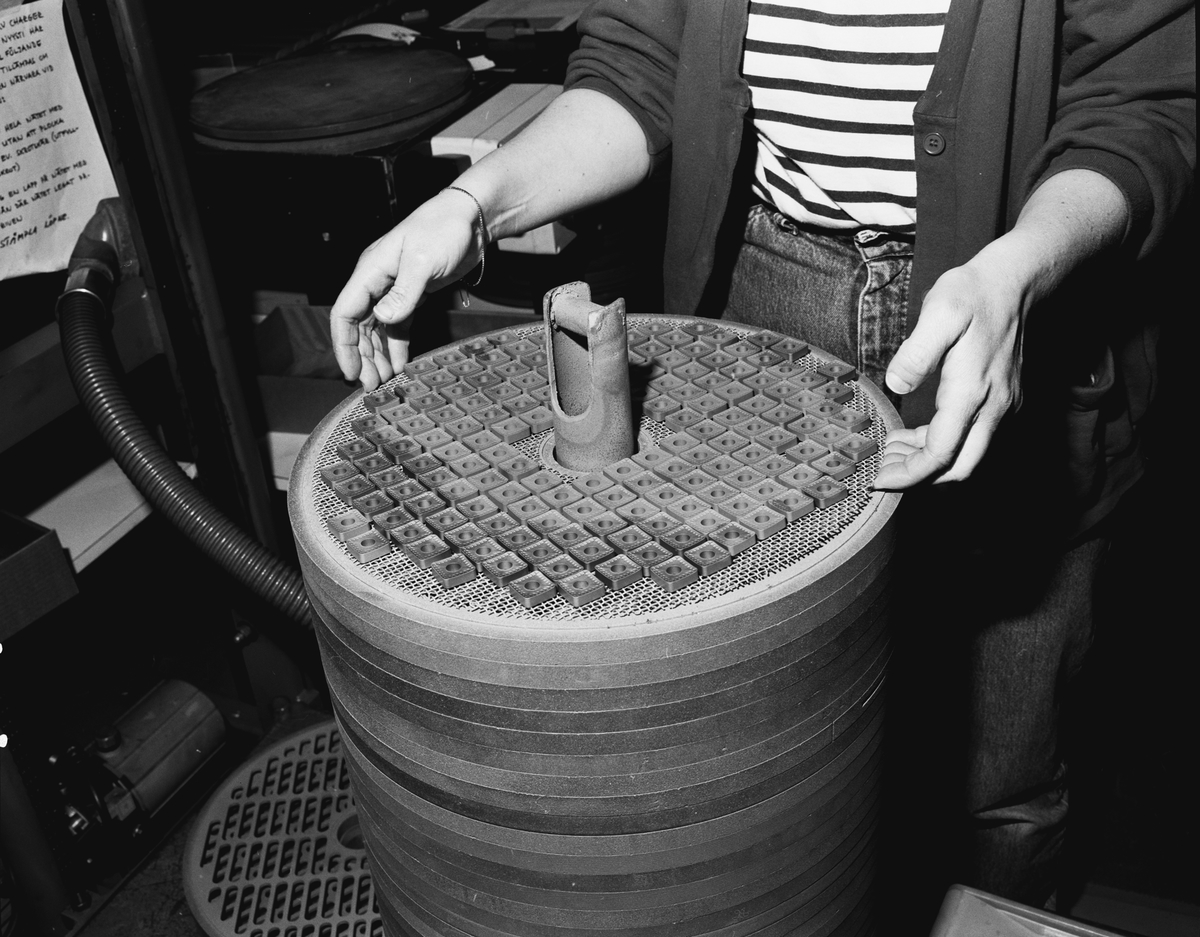RIVNING AV SKIKTBELÄGGNINGS-CHARGE. Efter att en besiktning utförts lyftes näten med skär från chargen till arbetsbordet där sortering sker ordervis före transport till nästa operation. Se även bild neg nr C 10435.