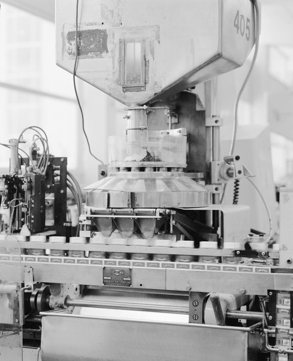 Arencomaskin. Fyllning av tabletter via "karusell" i svenska askar. T v syns den automatiska avkännaren för rätt mängd tabletter. En arm går ner i varje ask för att känna av nivån i asken. Vid fel mängd plockar en gripklo bort den.
